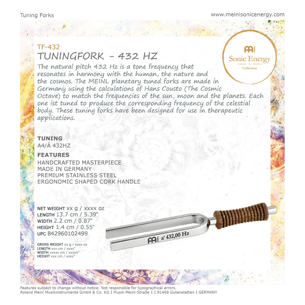 Furculițele de acordaj terapeutice Meinl Sonic Energy sunt realizate manual din oțel nichelat de calitate superioară, pentru o rezistență excepțională. Mânerul este din plută și are o formă ergonomică. Logo-ul gravat include detalii despre frecvența de acordaj.