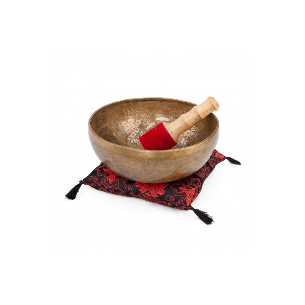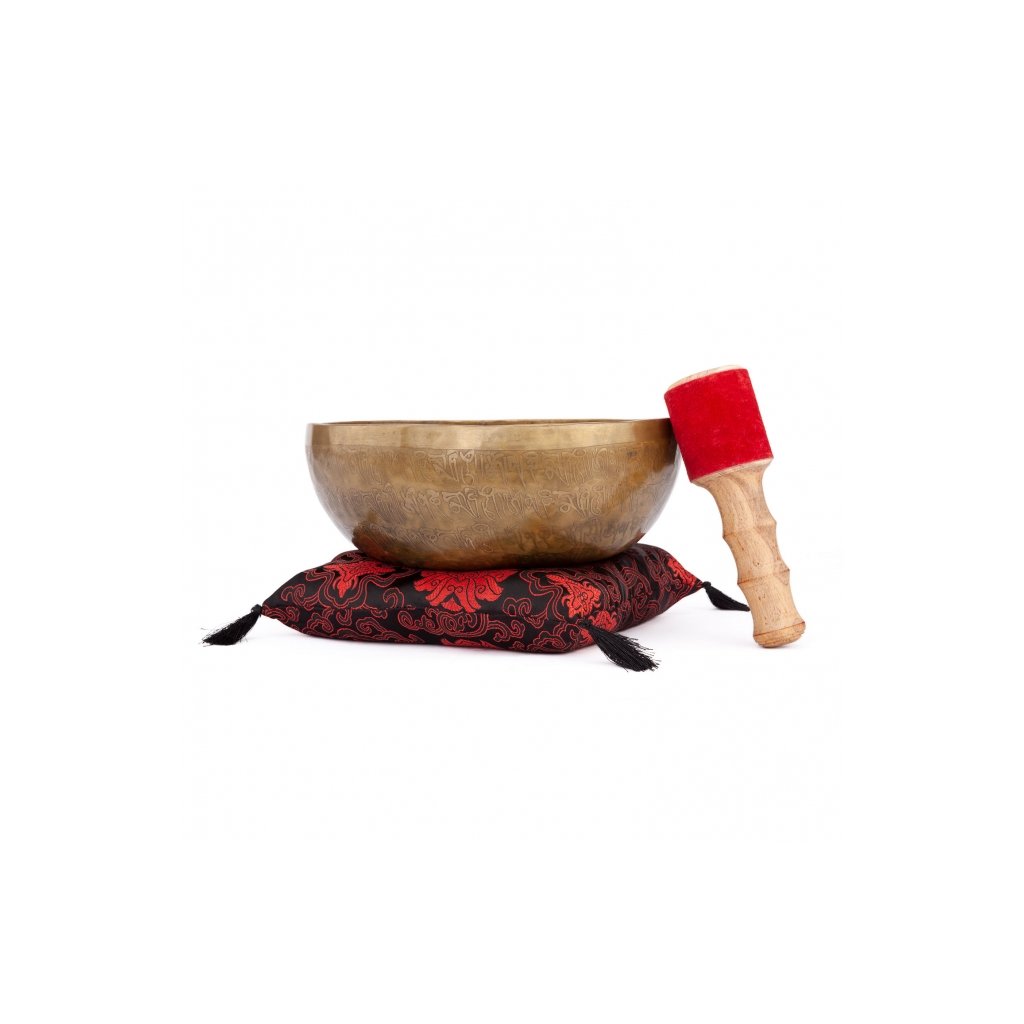 Bol cântător tibetan cu pernă și băț de lemn. Bolurile tibetane eliberează tensiunea din zonele blocate , au un efect relaxant și vindecător asupra corpului și minții, echilibrează emisferele și restabilesc energia în organe.