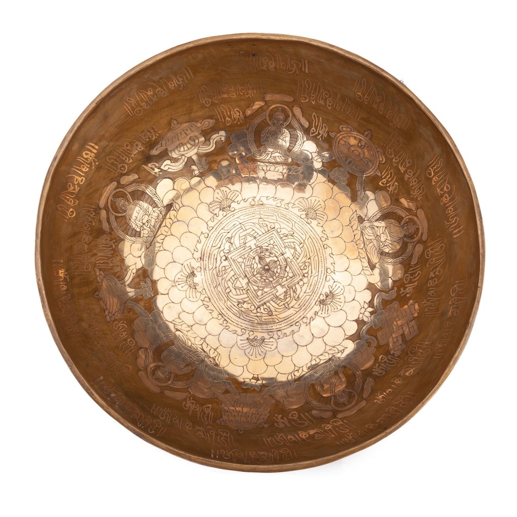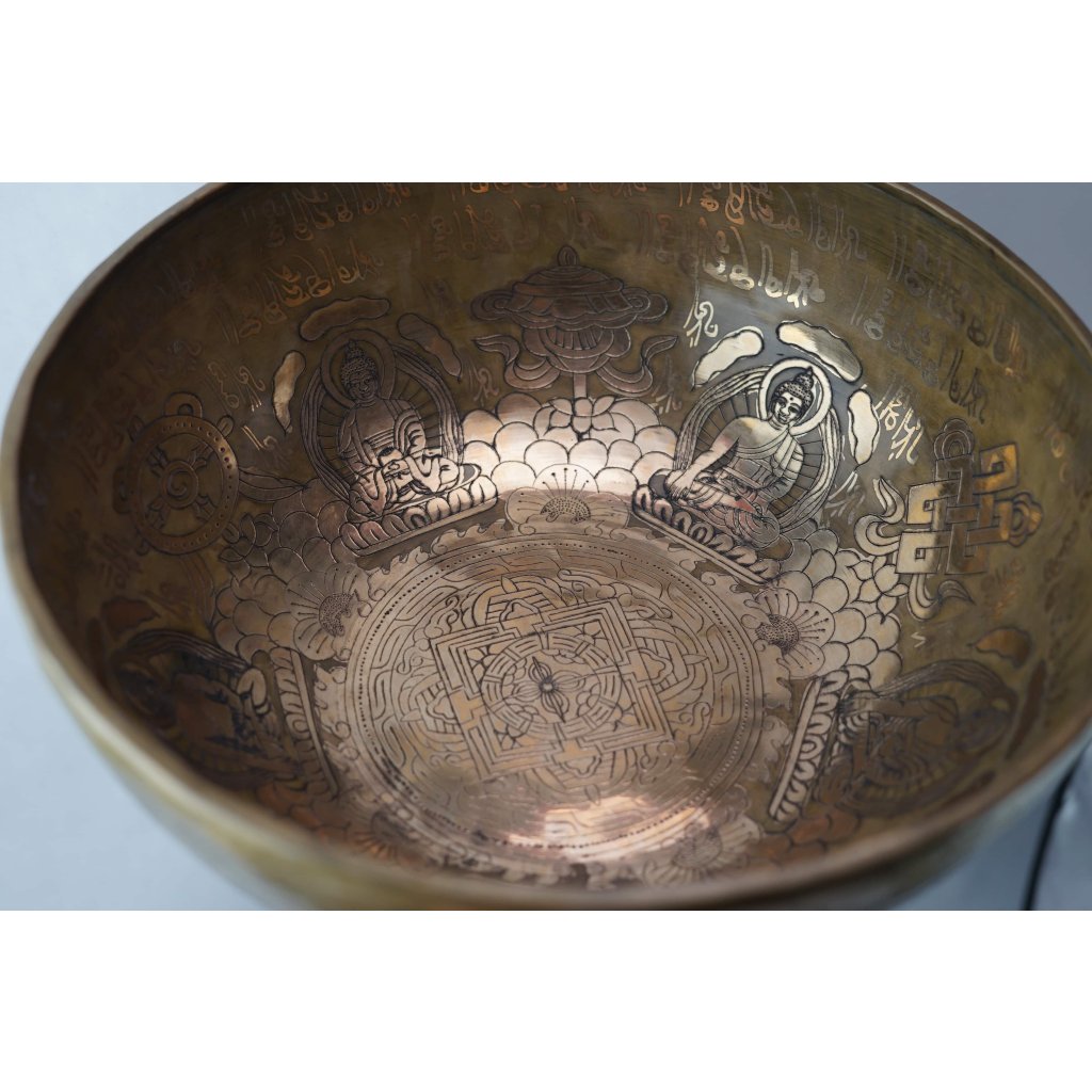 Bol cântător tibetan Bodhi cu 5 Buddha, 32 cm, lucrat manual, tonul D