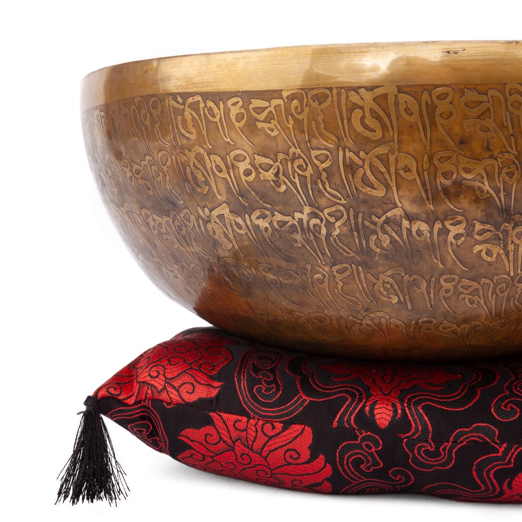 Bol cântător tibetan cu pernă și băț de lemn. Bolurile tibetane eliberează tensiunea din zonele blocate , au un efect relaxant și vindecător asupra corpului și minții, echilibrează emisferele și restabilesc energia în organe.