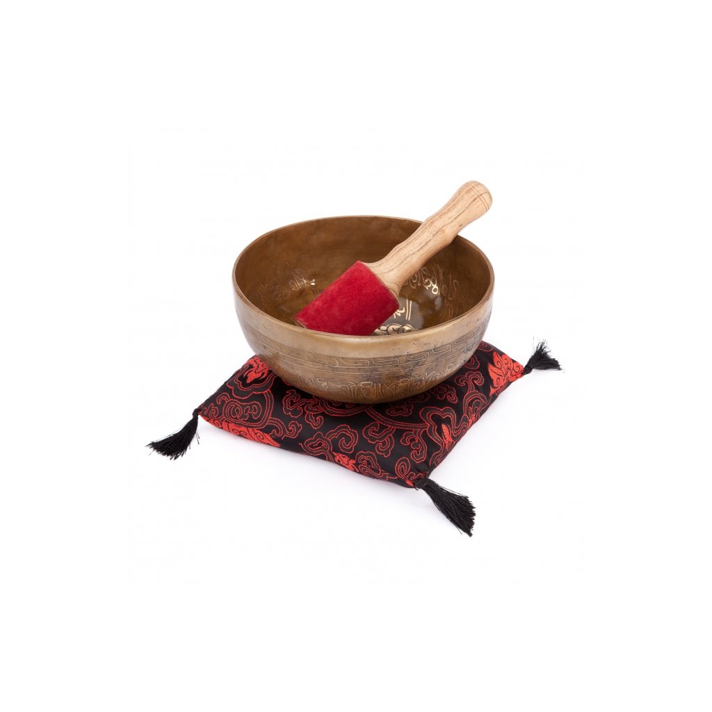 Bol cântător tibetan cu pernă și băț de lemn. Bolurile tibetane eliberează tensiunea din zonele blocate , au un efect relaxant și vindecător asupra corpului și minții, echilibrează emisferele și restabilesc energia în organe.