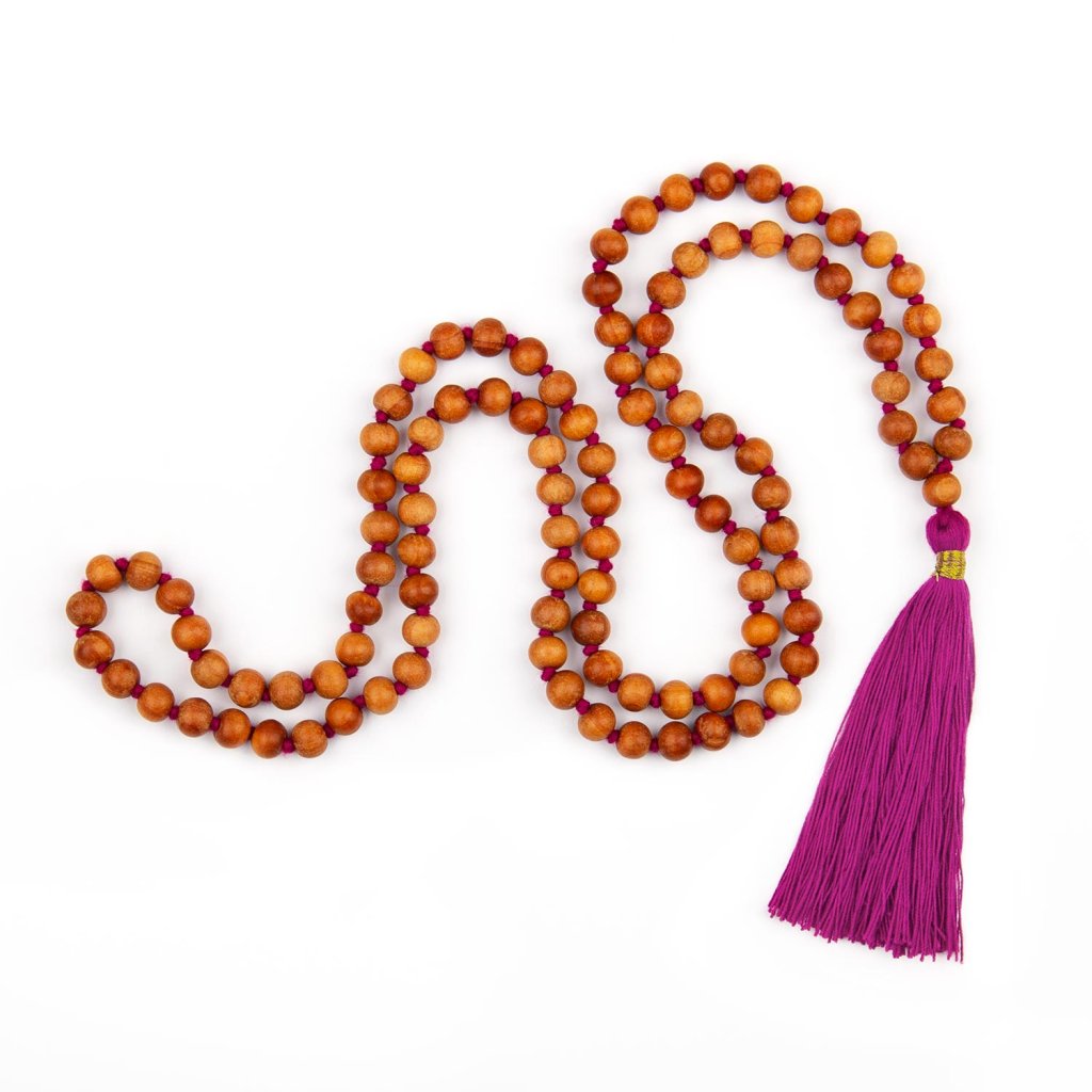 Colier Bodhi Mala din lemn de santal cu ciucuri colorați și mărgele de lemn de santal . Mala, sau Japa Mala, este un colier de rugăciune budist tradițional, ceva asemănător rozariului nostru. Există două dimensiuni de Japa Mala, un colier de obicei cu 108 mărgele și o brățară mai mică, de obicei cu 27 de mărgele. Japa înseamnă mantră, iar Mala înseamnă brățară de rugăciune.