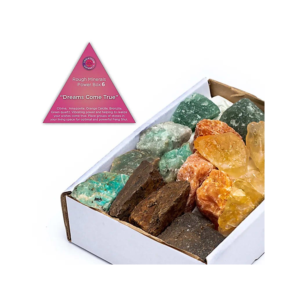 | Vise | Citrină brută (ametist ars), amazonit, calcit portocaliu, bronzit, cuarț verde. |