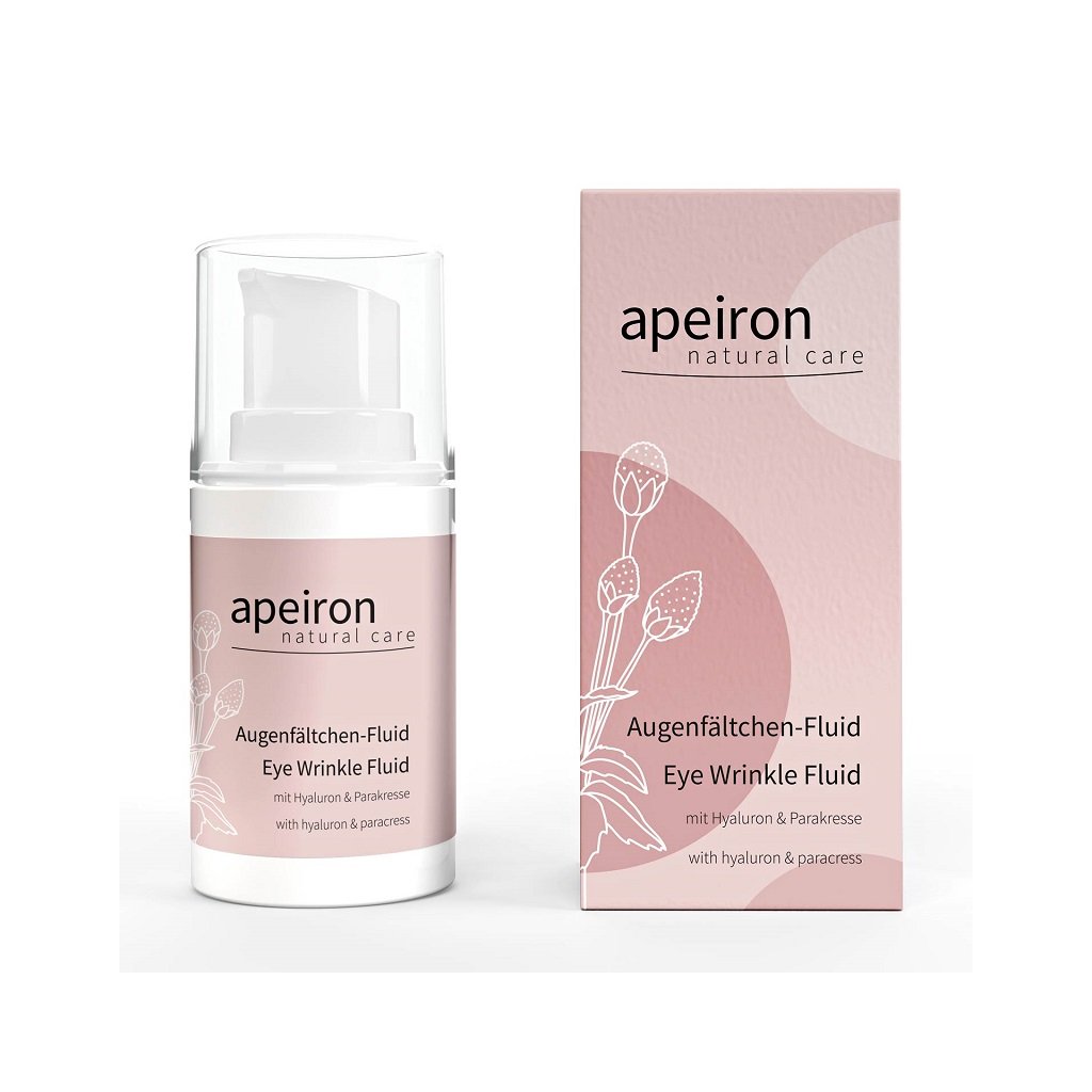 Fluidul antirid pentru ochi Apeiron regenerează și hrănește pielea cu ulei valoros de semințe de struguri organic și ulei de argan organic. Acidul hialuronic extrem de concentrat leagă și stochează, de asemenea, umiditatea valoroasă. Acmella (gatulină de năsturel) conține ingredientul activ Spilanthol, despre care s-a demonstrat că reduce vizibil ridurile. Extractul antioxidant de ciuperci organice și vitamina E naturală protejează pielea de influențele dăunătoare ale mediului.