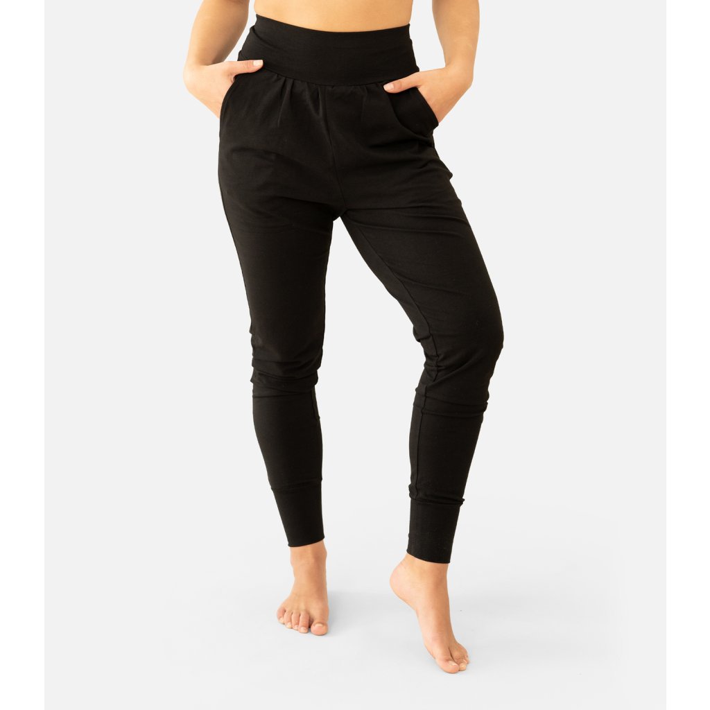 Pantaloni de yoga pentru femei din bumbac, de culoare neagră, cu o croială casual. Indiferent dacă ești în poziția Warrior sau în timpul antrenamentului în circuit, acești pantaloni lejeri pentru femei oferă libertate maximă de mișcare. 2 buzunare practice pe laterale, cu mult spațiu pentru cele mai importante lucruri, cum ar fi telefonul mobil, cheile și portofelul.