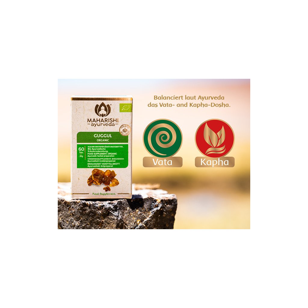 Maharishi Ayurveda Guggul este o rășină gumoasă a arborelui indian de smirnă. Rășina se obține în mod tradițional prin tăierea trunchiului arborelui de balsam sau smirnă și protejează împotriva bolilor. Este recomandată în special pentru dezechilibrele Vata și Kapha Dosha.